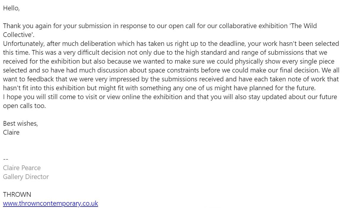 Despite being unsuccessful with my submission for 'The Wild Collective,' I still gained experience in applying to an open call, and would feel more confident in future reaching out to galleries. After speaking to Claire Pearce in person, I was able to gain a further insight into what gallerys would be inclined to exhibit, and gained a further understanding on the pricing of my work.