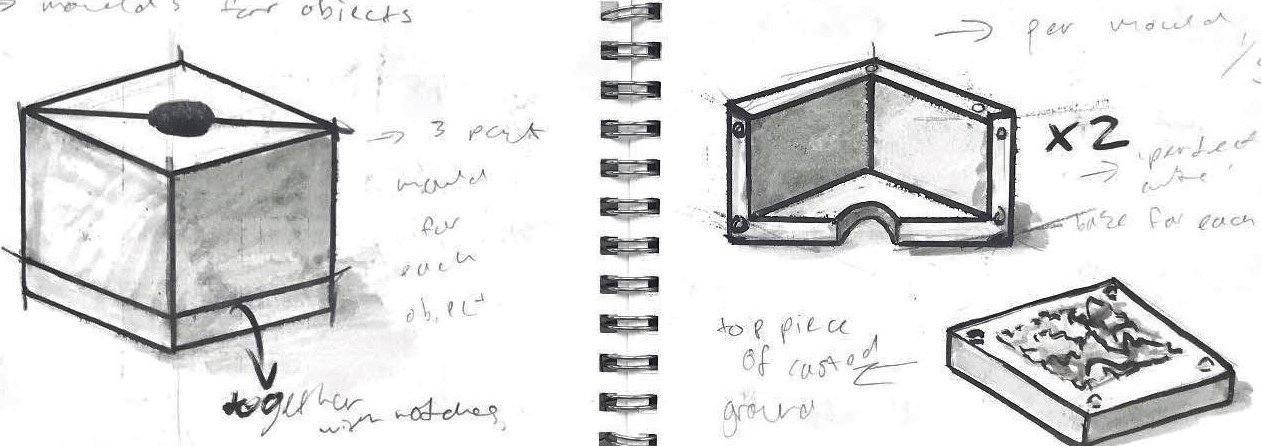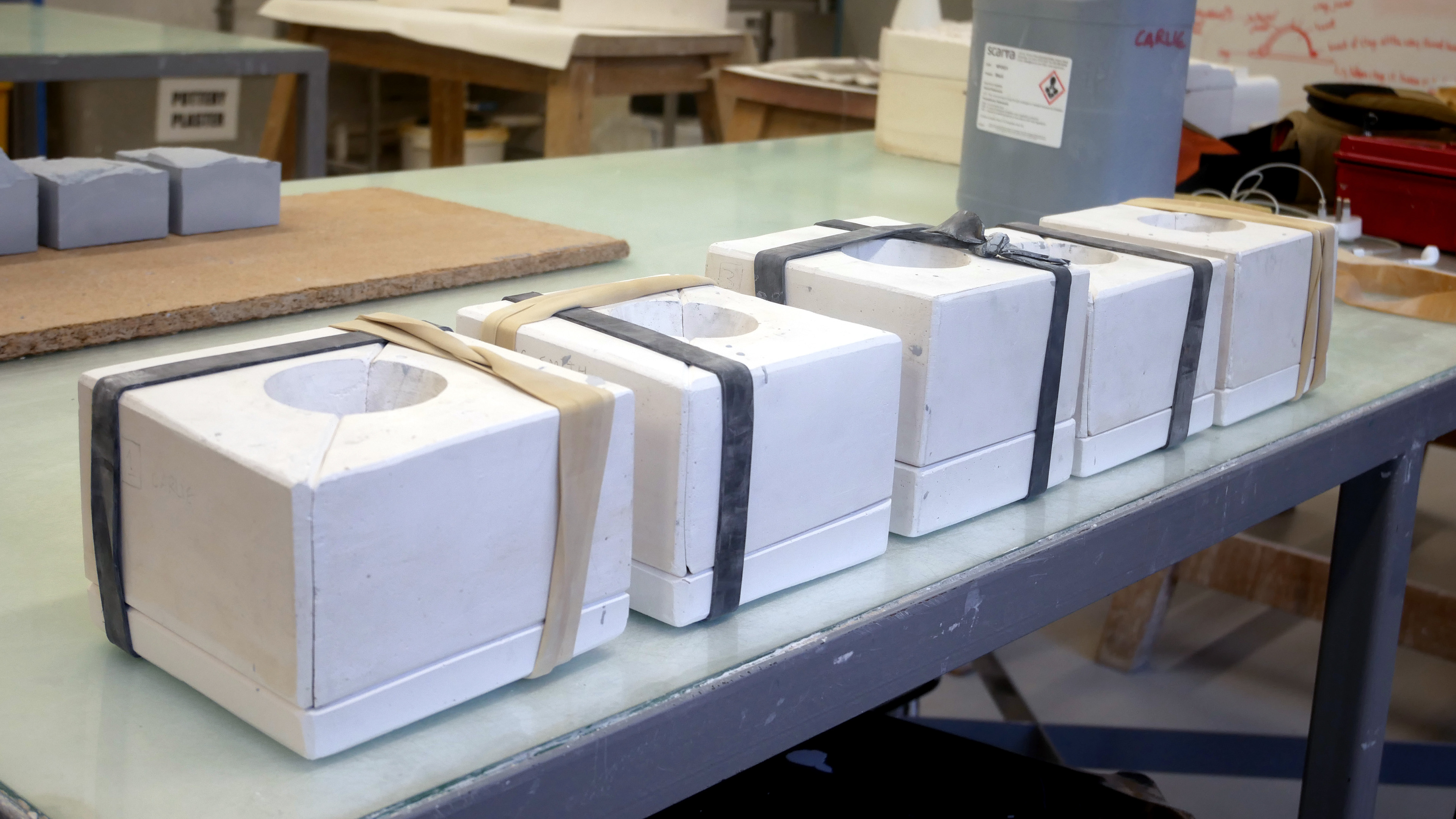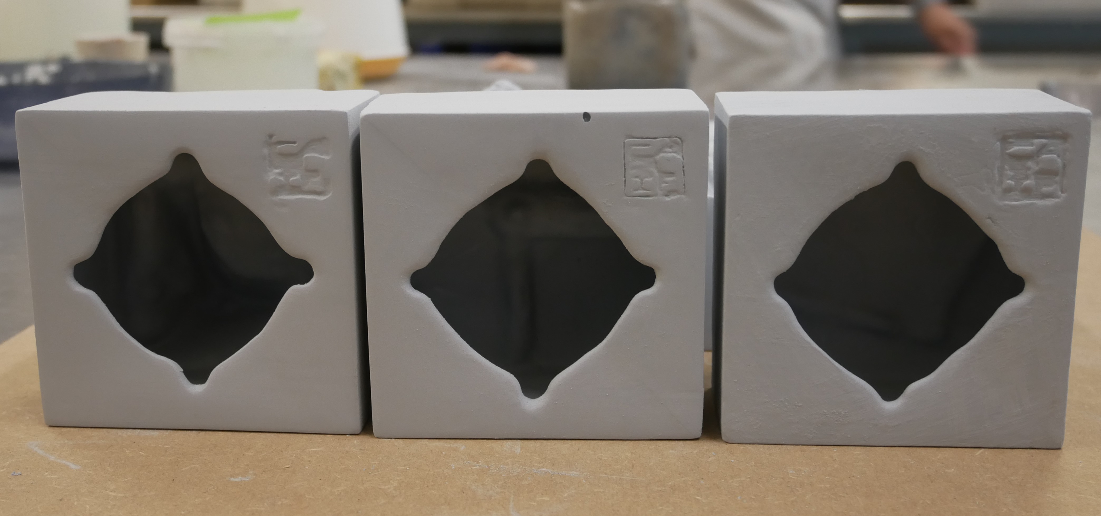 I chose to design and create the moulds in a three-part approach which allowed for the bottom two pieces to be removed diagonally whilst the more fragile, textured piece could stay flat on a surface.
