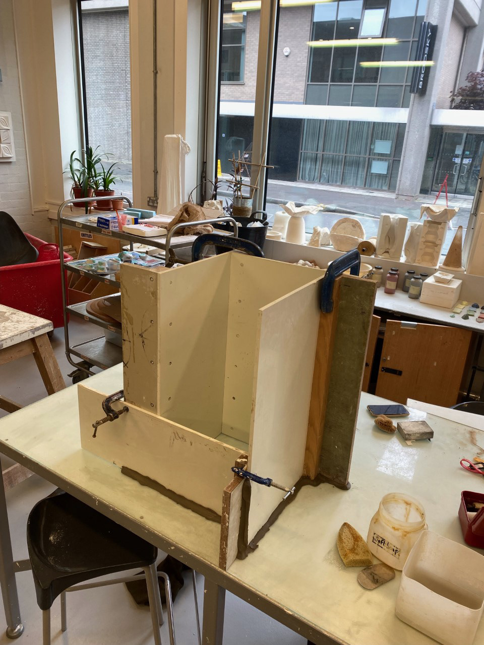Creating the 30 x 30cm mould was by far one of the most difficult tasks I have undertaken. The first time I poured for the mould, the cottle slipped and the plaster spilled everywhere. This was demotivating, but I restarted and got some assistance the second time.