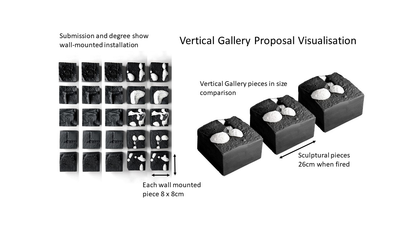 For the Vertical Gallery, I proposed to scale up my pieces to 30 X 30 X 20 cm. In our initial meeting with Kate and Claire, I was shown my position in my exhibition; at the front entrance on the right hand side.