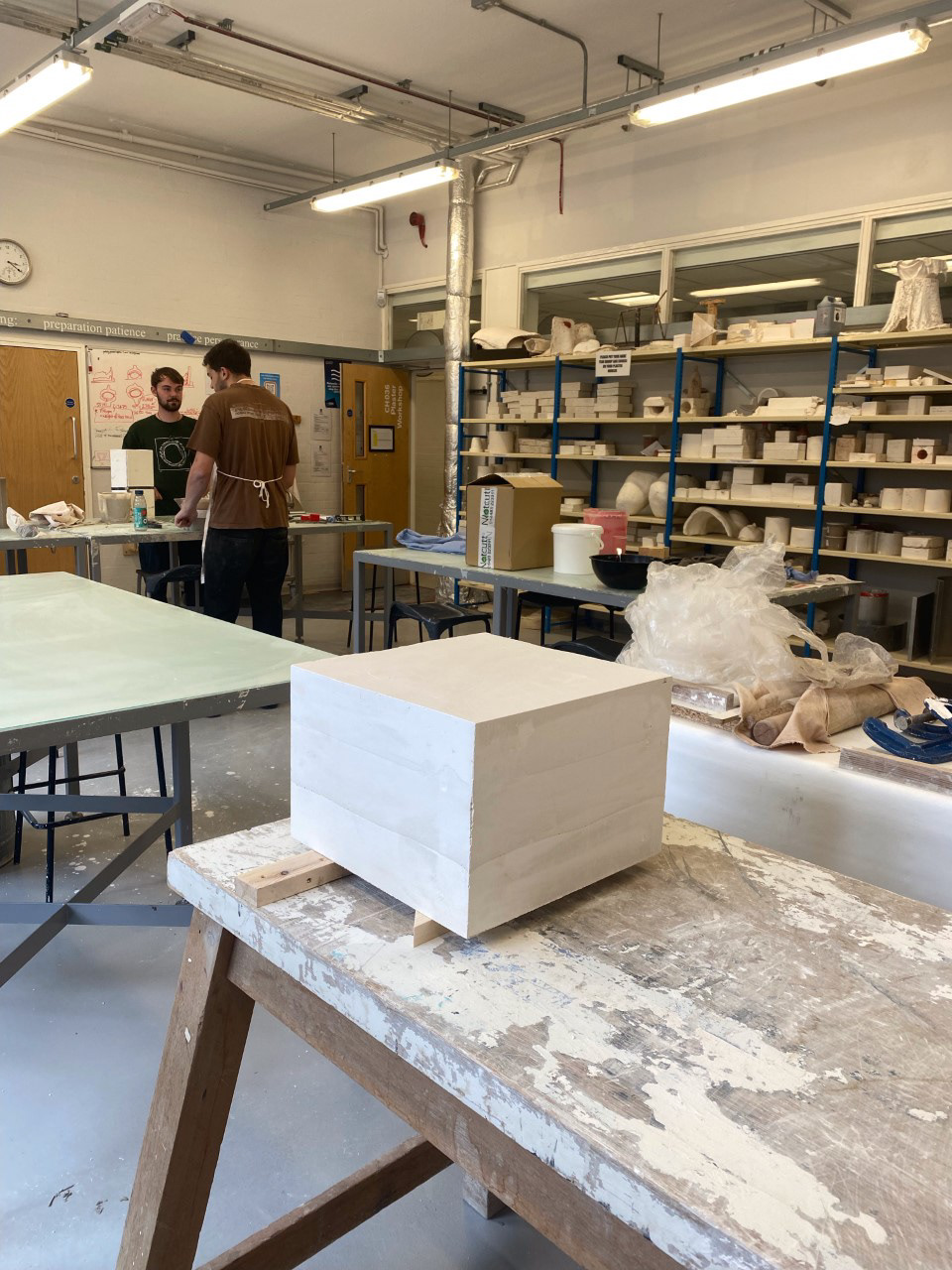 Whilst scaling up, there was many factors to consider such as managing the weight of the plaster in addition to creating a perfectly cuboid object. I chose to cast the block of plaster separate to the Vinamold cast to obtain as close to perfection as possible.